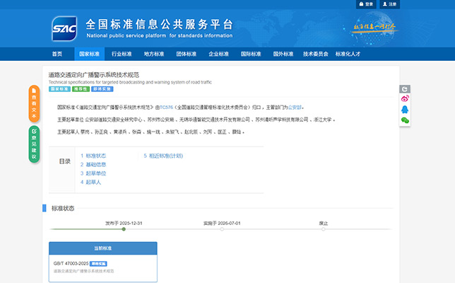 近日,國(guó)家市場(chǎng)監(jiān)督管理總局、國(guó)家標(biāo)準(zhǔn)化管理委員會(huì)批準(zhǔn)發(fā)布360項(xiàng)推薦性國(guó)家標(biāo)準(zhǔn)。其中,由公安部道路交通安全研究中心牽頭,蘇州清聽(tīng)聲學(xué)科技有限公司深度參與起草的《道路交通定向廣播警示系統(tǒng)技術(shù)規(guī)范》,正式列入國(guó)家推薦性標(biāo)準(zhǔn)體系,標(biāo)志我國(guó)在道路交通定向聲警示領(lǐng)域邁入標(biāo)準(zhǔn)化、規(guī)范化發(fā)展的新階段。《道路交